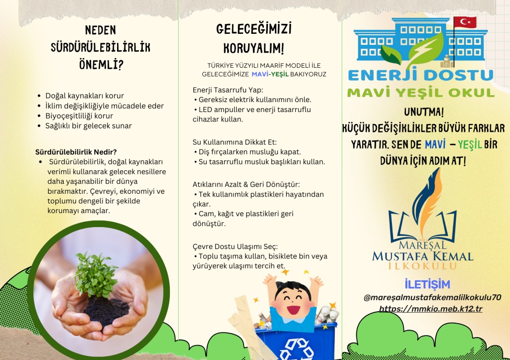 Okulumuz, sürdürülebilir bir gelecek için önemli bir adım atarak “Enerji Dostu Mavi Yeşil Okul” etiketi almak amacıyla çeşitli etkinlik ve uygulamalar hayata geçiriyor.Bu kapsamda, enerji verimliliği, su tasarrufu, geri dönüşüm ve çevre bilinci konularında farkındalık oluşturmak için öğrenci ve öğretmenlerimizin katılımıyla birçok etkinlik planlanmış olup eylem planımız doğrultusunda çalışmalar başlayacaktır..